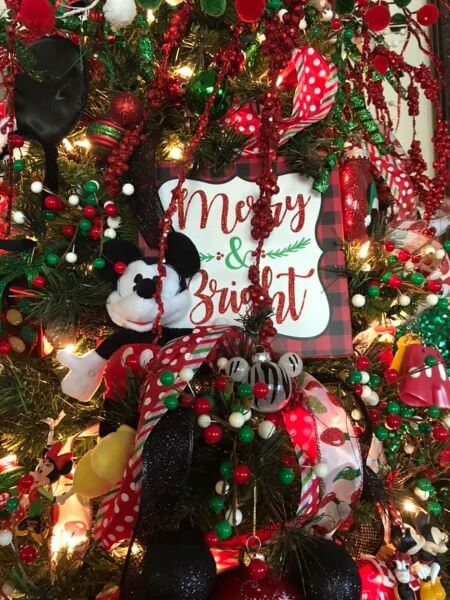 Mickey Mouse-themed tree with plushies, ornaments, ribbons, and more