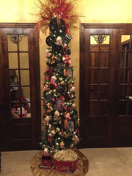 Movie-themed tree for client's movie room included popcorn and snack ornaments and film reel topper