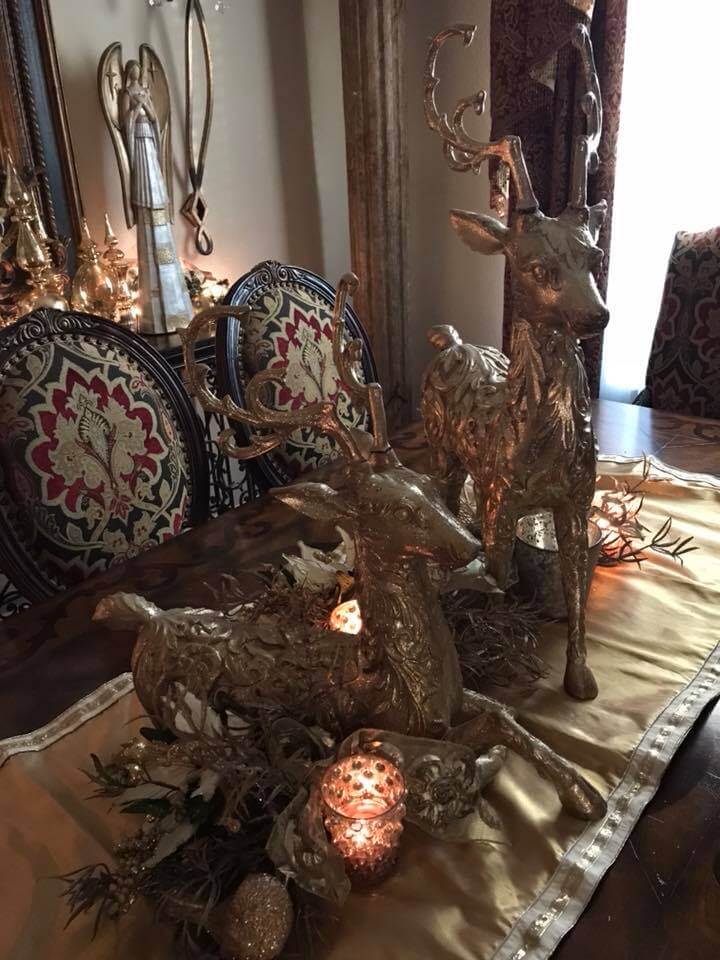 Formal dining room table with reindeer centerpiece and table runner